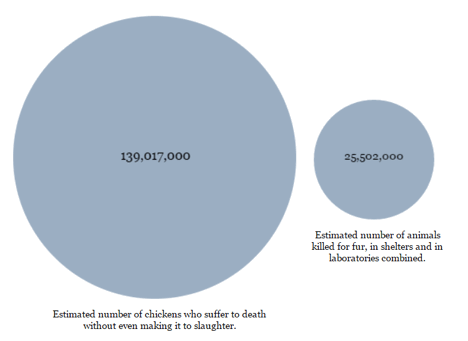These birds die of disease, or are killed because they aren’t growing quickly enough, or their legs break leaving them unable to make it to water, or have their hearts just give out. Harish’s calculations show that so many chickens suffer to death that their number dwarfs all those killed for fur, in shelters, and in labs. Again – this isn’t the number of chickens killed overall, just the number who suffer to death before even getting to slaughter.